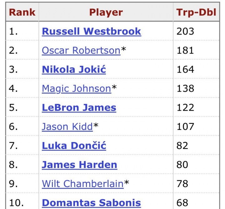 目前,约基奇以164次三双排名NBA历史第三位,距离超越榜首的威少(203次)还差40次,第二是奥斯卡-罗伯特森(181次)。